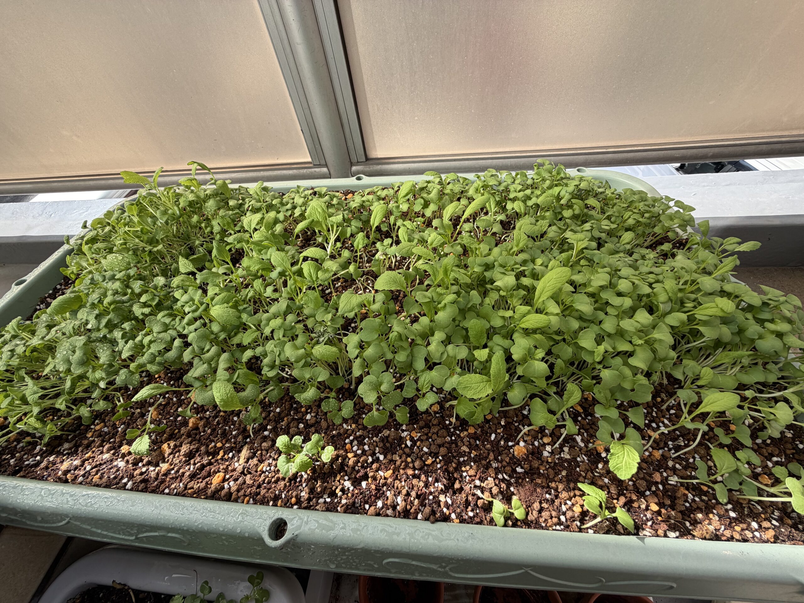 新しくまき直したカブが順調に育っています。双葉も大きく広がり、健康そのもの。間引きのタイミングを見極め中。